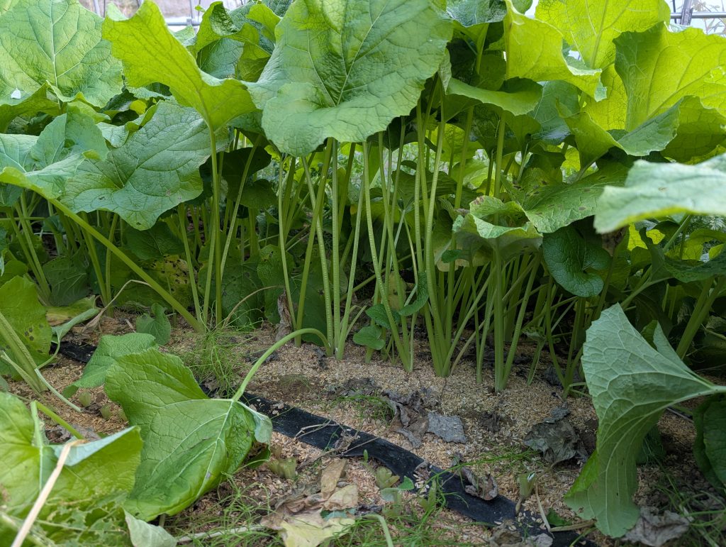 今回の栽培ではハウスの中で9月10日に播種し、概ね11月末には草丈40cm程に生長した。育てる分には発芽には光が必要なので、覆土は薄くすることが大事というほかはいずれも同じように肥料と潅水であろうか。葉が大きいので蒸散量が多いとすれば、それに応じた潅水が必要というものである。果実を収穫するのに比べ栽培は楽である。